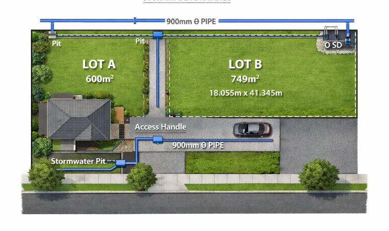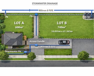 The Proposal included a new stormwater strategy is included, using an inter-allotment drainage easement that runs along nearby rear boundaries and connects to an approved street discharge point. Also new access handle and drive ways.